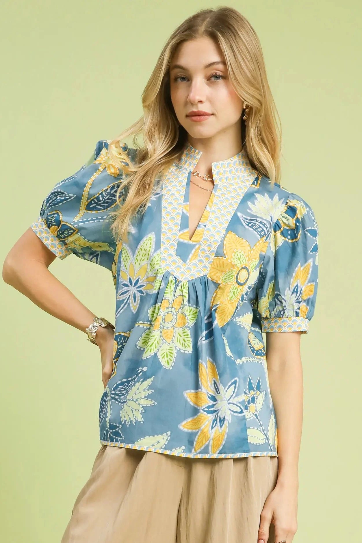 This abstract floral patchwork top features a split V-Neck, short puff sleeves, and contrast trim. Not Lined
