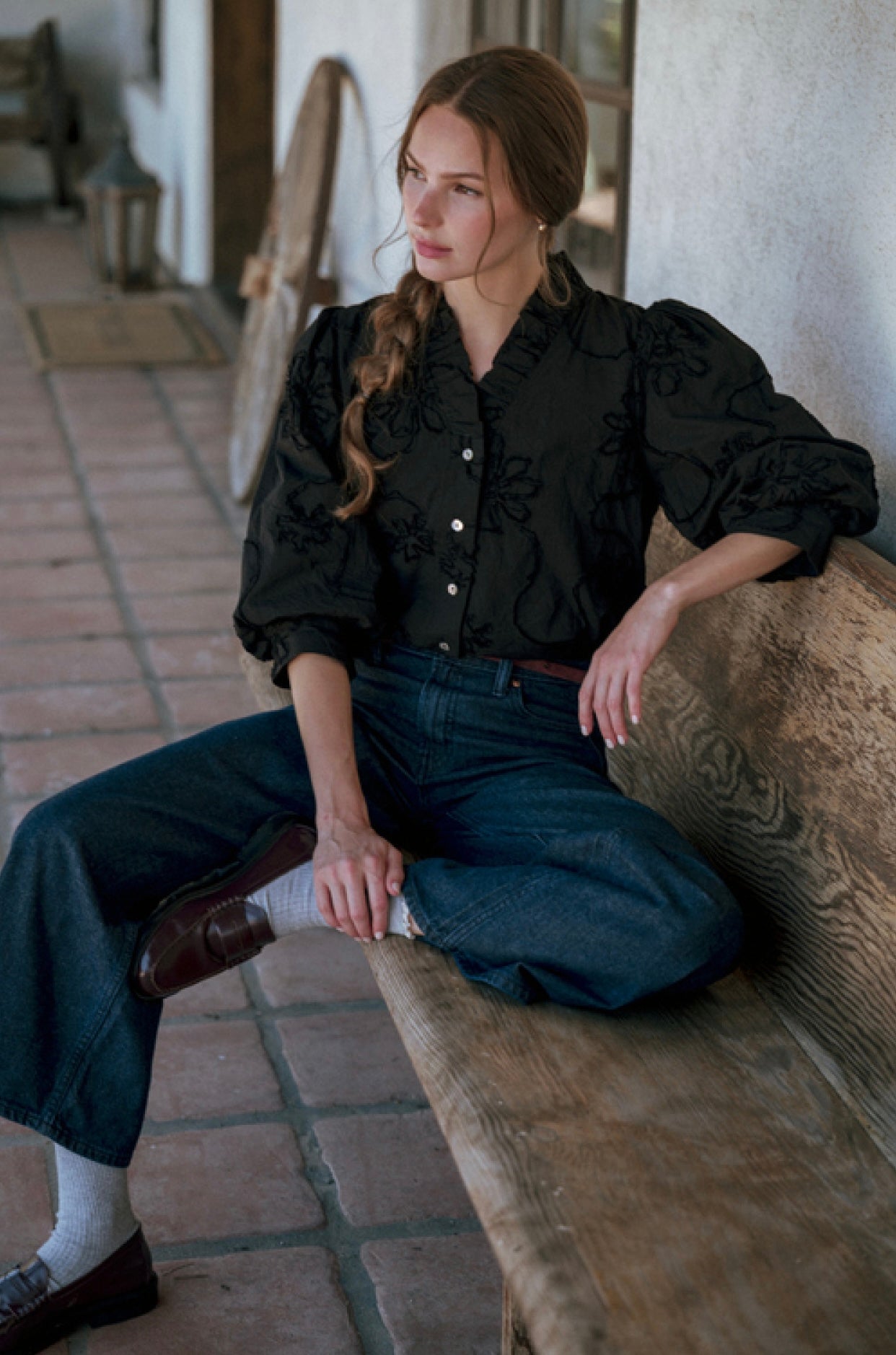 This black 3/4 sleeves button down 3D floral top features textured fabric and ruffled neckline.100% Cotton