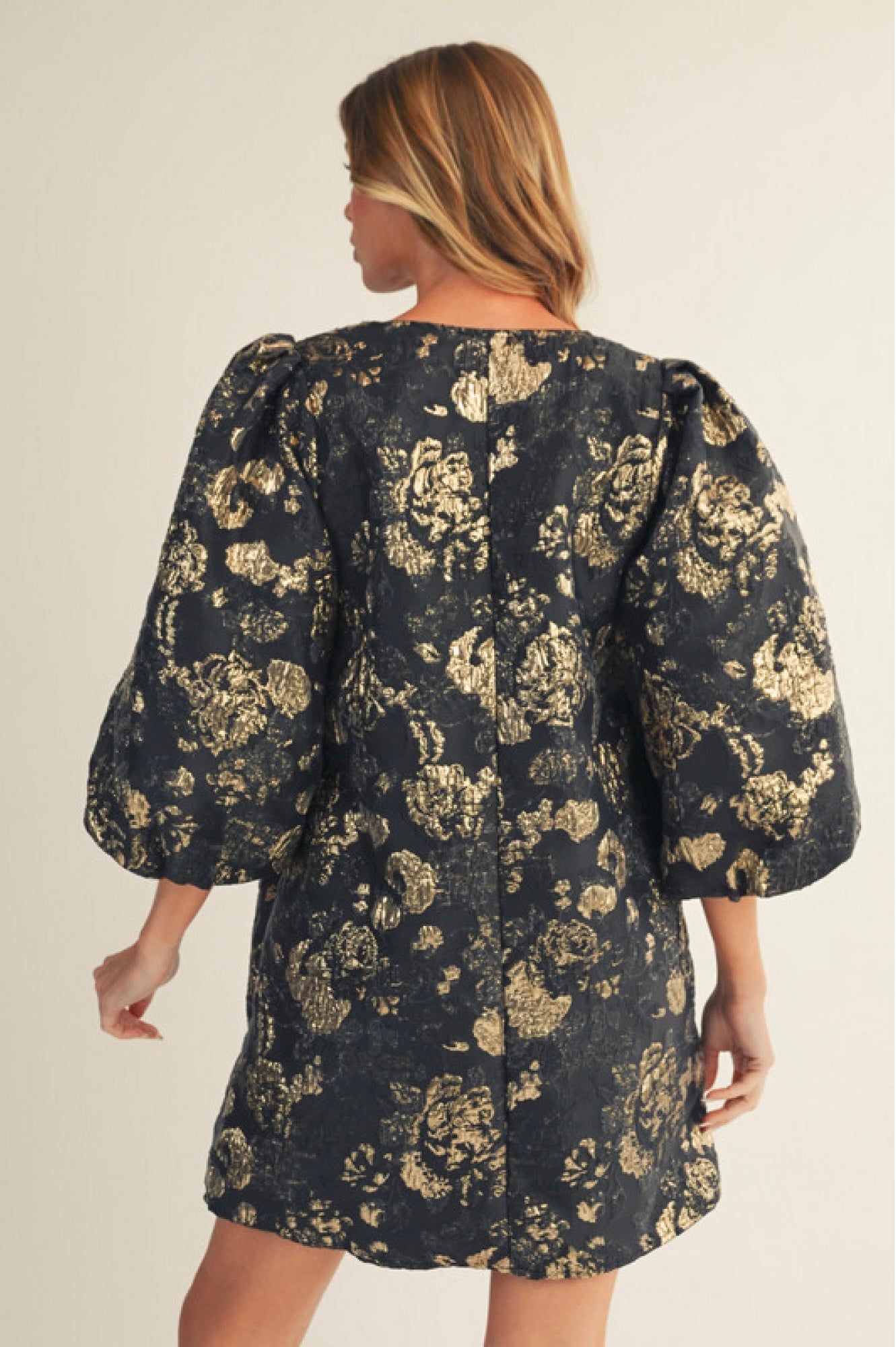 This beautiful floral jacquard dress features 3/4 puff sleeves and side pockets. It is the perfect party dress.