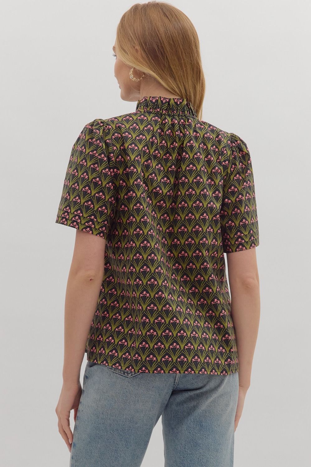 This black geometric print top features a ruffled mock neck and adjustable self-tie detail at neckline. Tie-front closure. Unlined. Woven. Non-sheer. Lightweight.