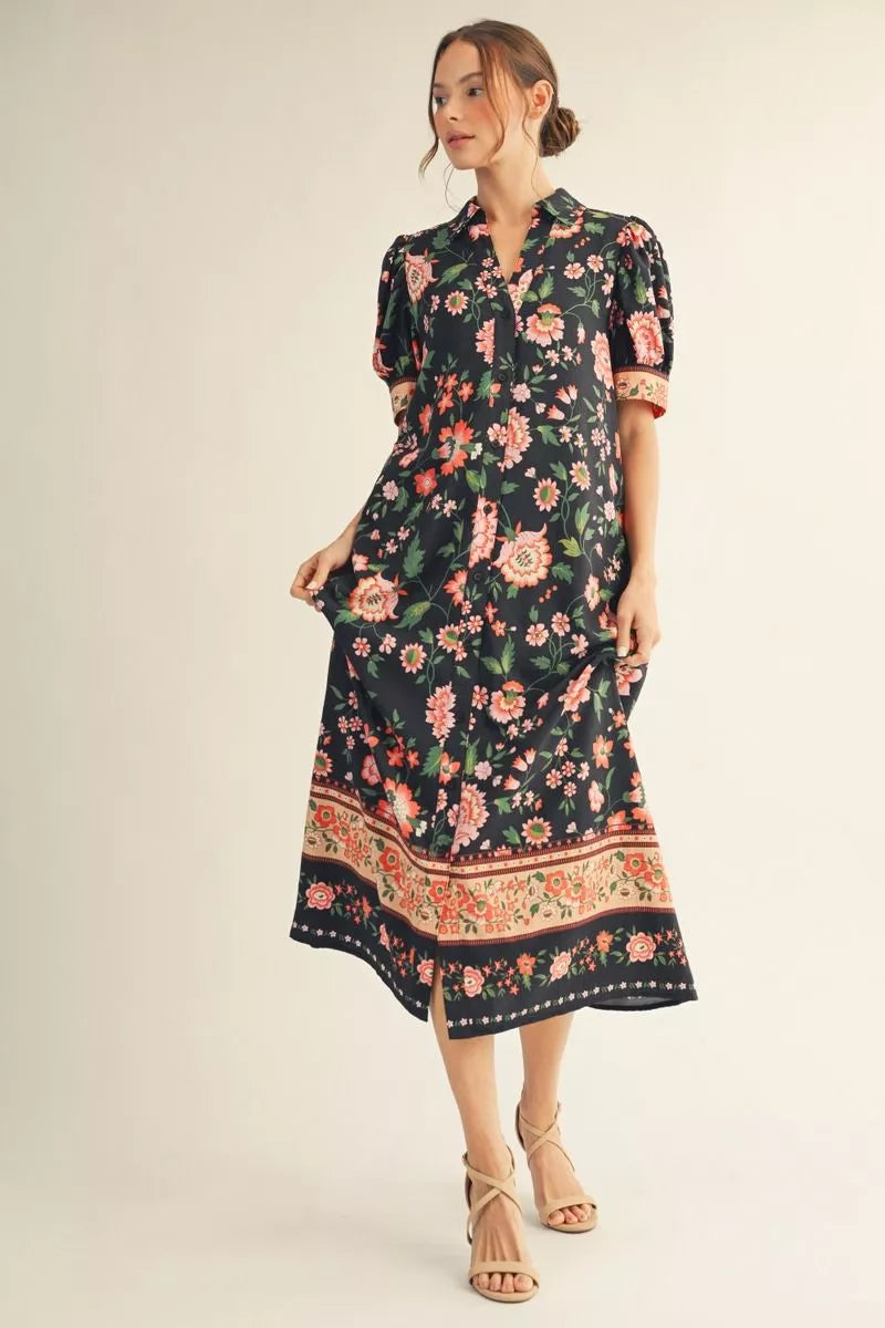 A twist of floral! This midi dress features short sleeves, button front, and side pockets.