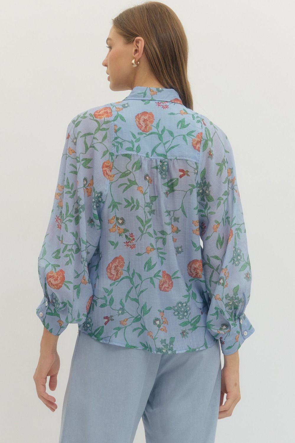 Flowy and floral are the best combo! This floral print long sleeve top features button closure at front and shirt collar. Buttoned cuffs. Lined. Woven. Semi-sheer. Lightweight.