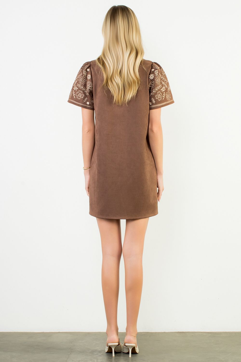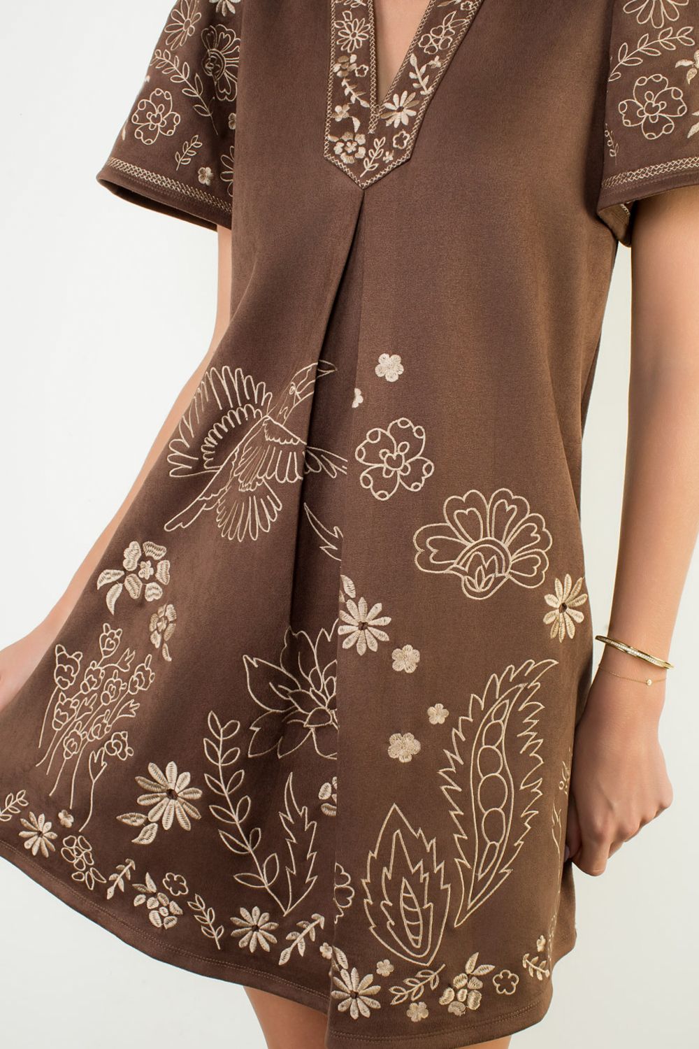 This brown suede look dress features beautiful embroidery details . It is a must have!93% Polyester, 7% Spandex