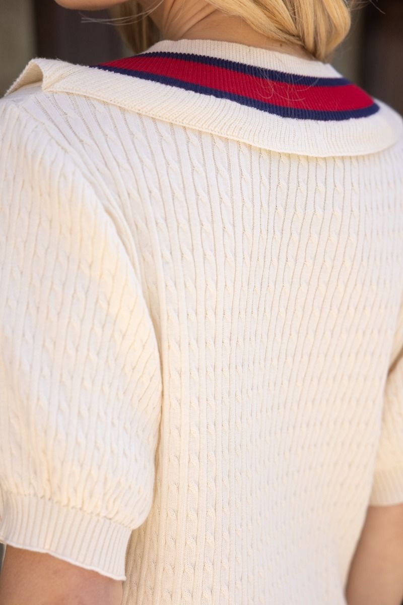 This cute ribbed knit sweater features striped band details, ruffle V neckline and short sleevesVoy