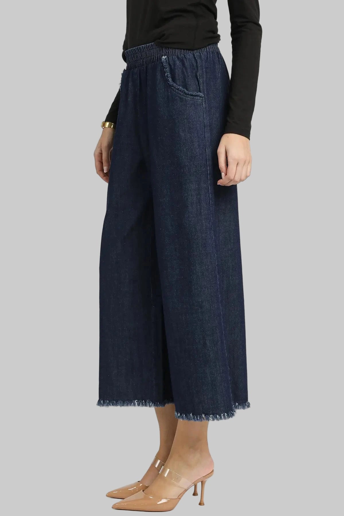 Cute frayed detail cropped jeans. Perfect for year round wear. They feature an elastic waistband. wide leg, and side pockets.85% Cotton, 15% Polyester