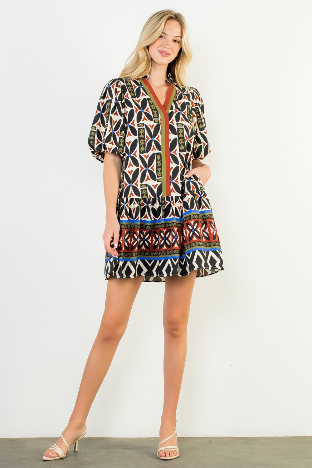 This cute dress features beautiful earth-tone colors and block print accents. Side pockets. Lined.