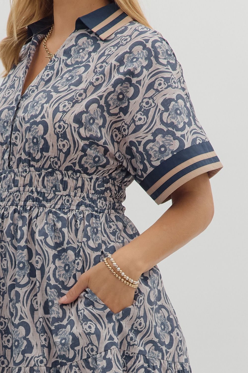 This midnight blue floral print midi dress features a multicolor band V-neck collar button closure, elastic waistband, side pockets, and short sleeves. Lined. Woven. Non-sheer. Lightweight.