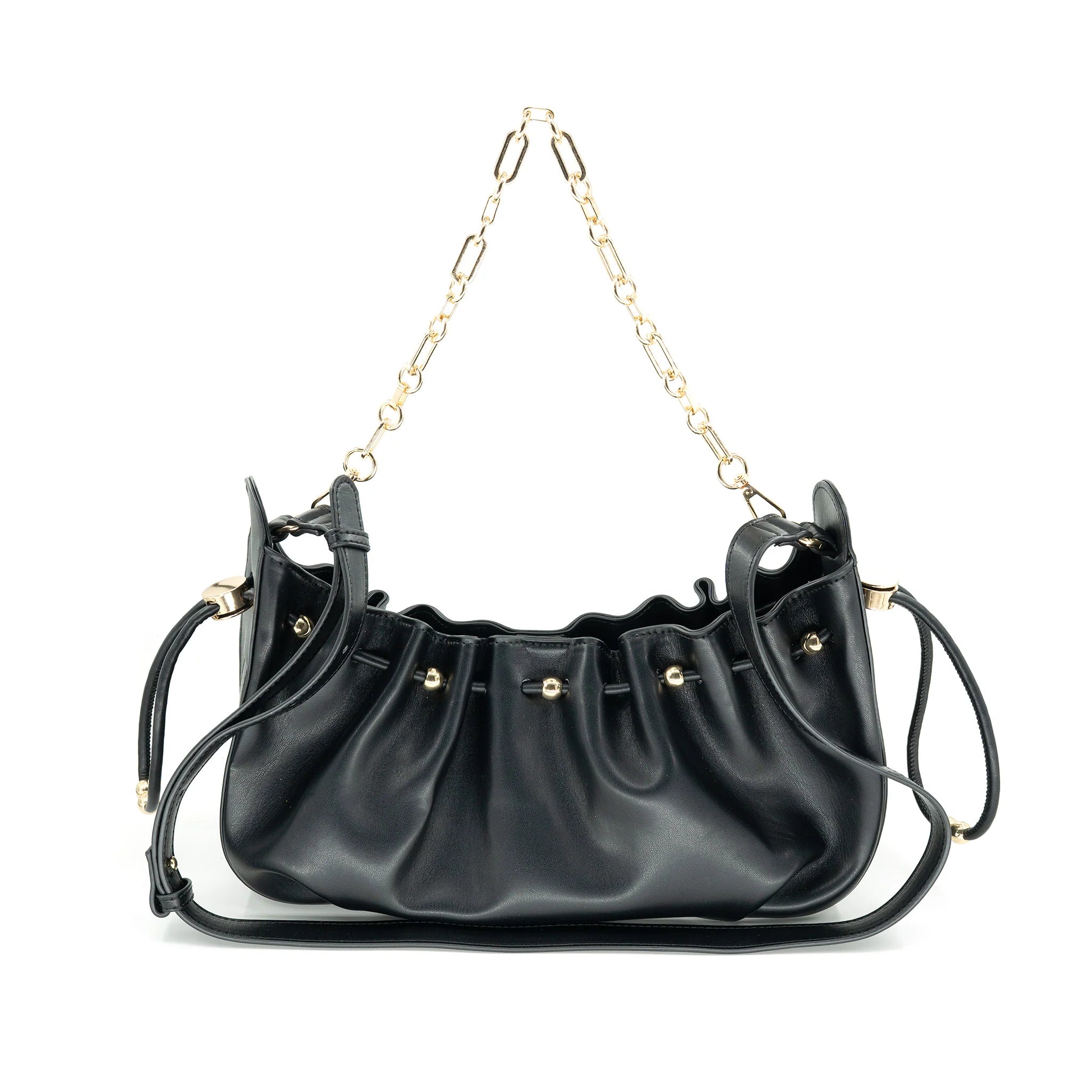 This cute vegan leather bag a the new style and a must for your wardrobe. Includes a chain strap and a vegan leather strap. Beautiful polished gold hardware. Magnetic closure. Inside zip pocket and double open pouch.