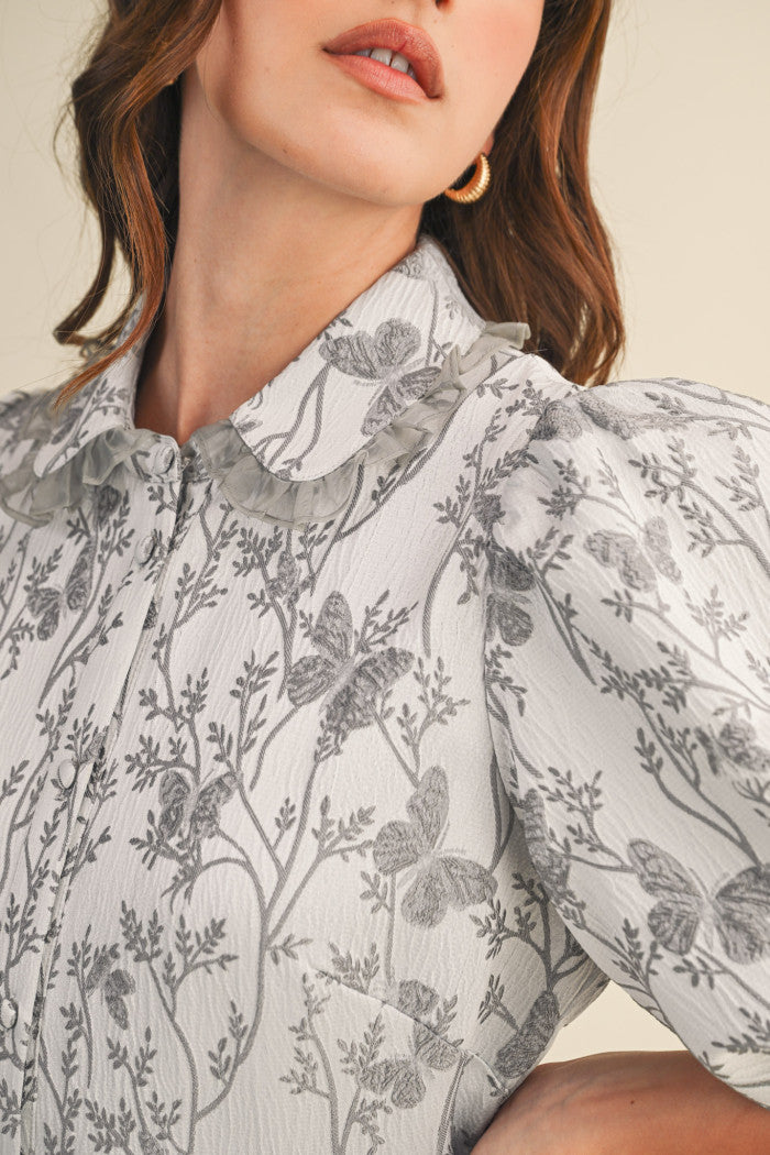 We’re dreaming of all the romantic days in this jacquard bubble sleeve midi dress! This dress features butterfly fabric shapes, short bubble sleeves, a collared neckline, and full button down placket. Sheer mesh ruffle trim on the collar adds darling detail. Belt loops and a self tying belt accentuates the waist as it flows down into an A-line midi skirt with pockets.