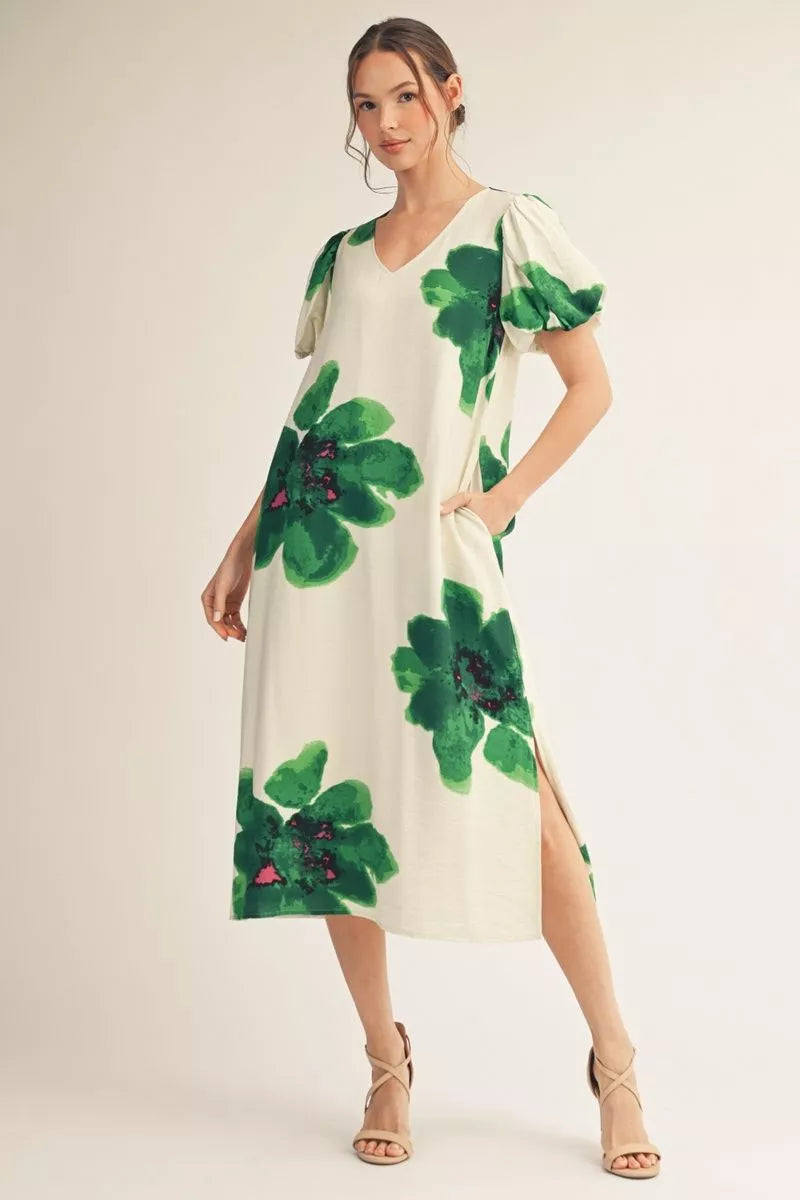 This beauty gives you a tropical vibe! Perfect for vacation or even work. Side slit. Side pockets.
