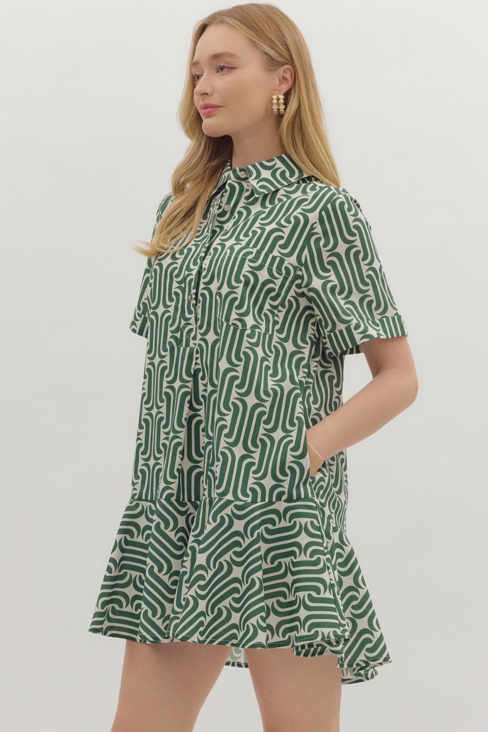 We love this green abstract pattern dress. It features short sleeve, collar, and button front closure. Pockets at sides. Lined. Woven. Non-sheer. Lightweight.