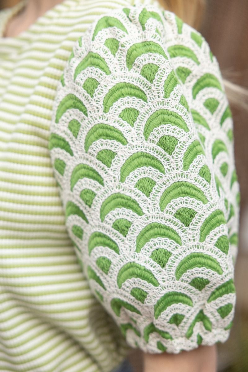 Love this green! This top features a round neckline, short contrast scallop embroidered sleeves and back button closure.