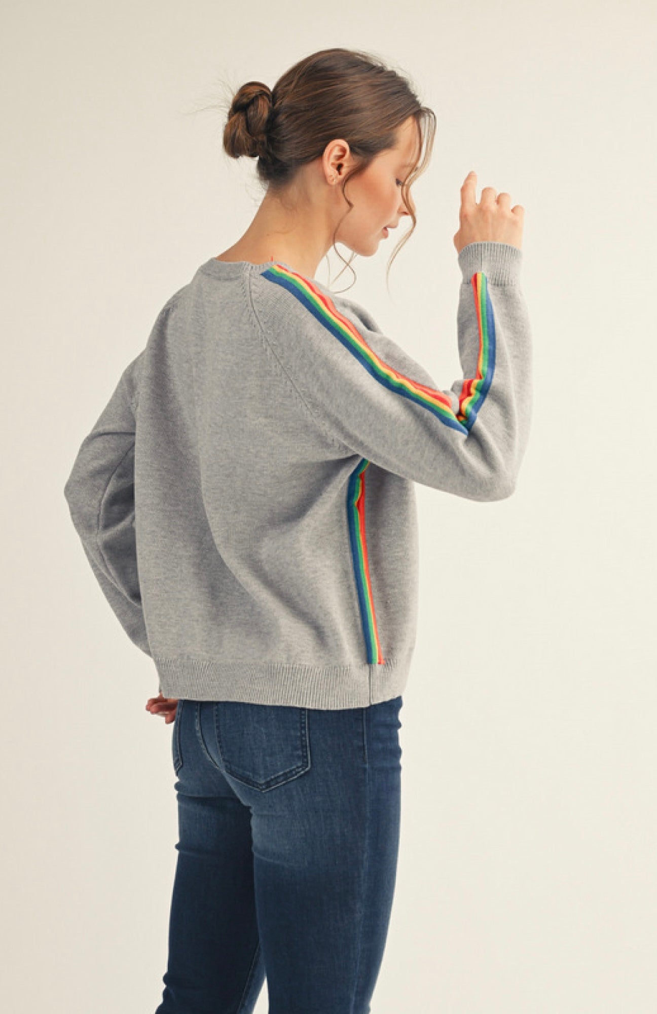 This heather gray sweater features long striped accent sleeves.