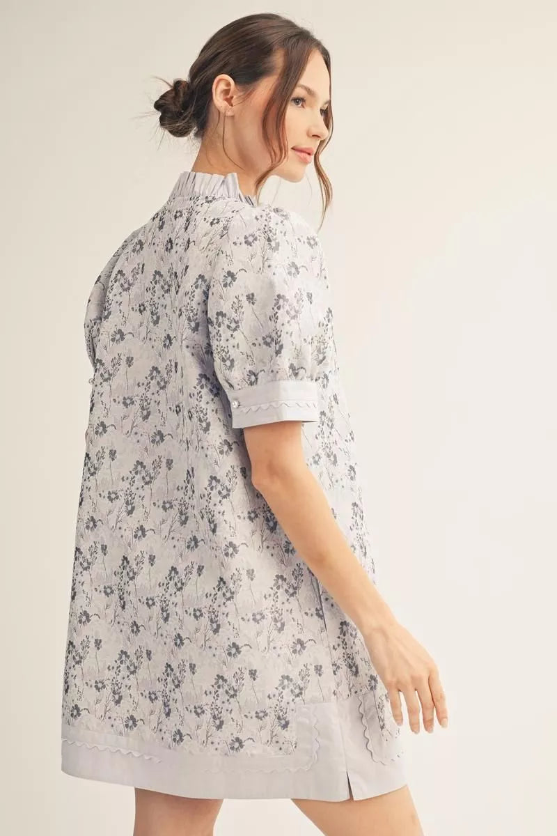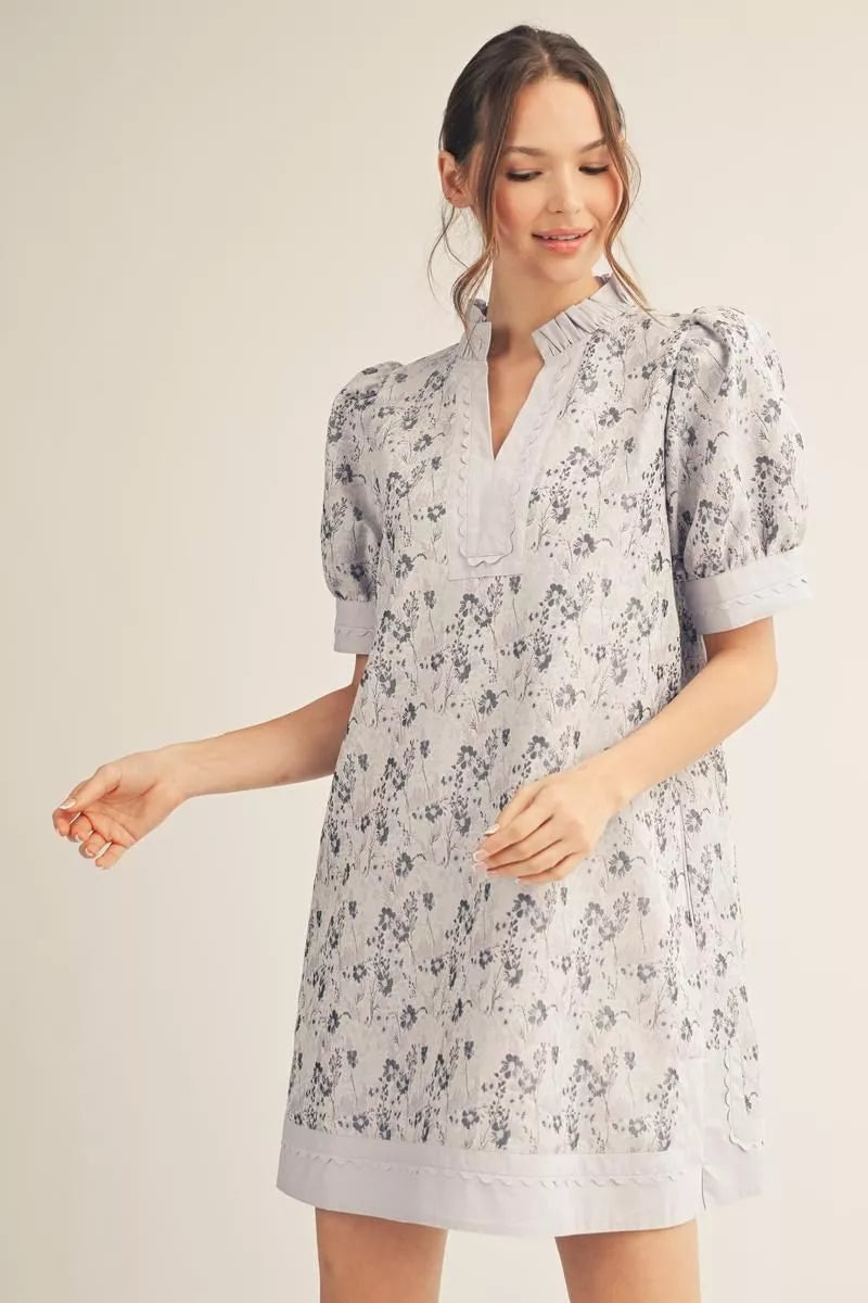 This dress has it all. It features textured fabric, contrast trim, ruffles, and ric-rac. Color is light blue but has a lilac hue to it.