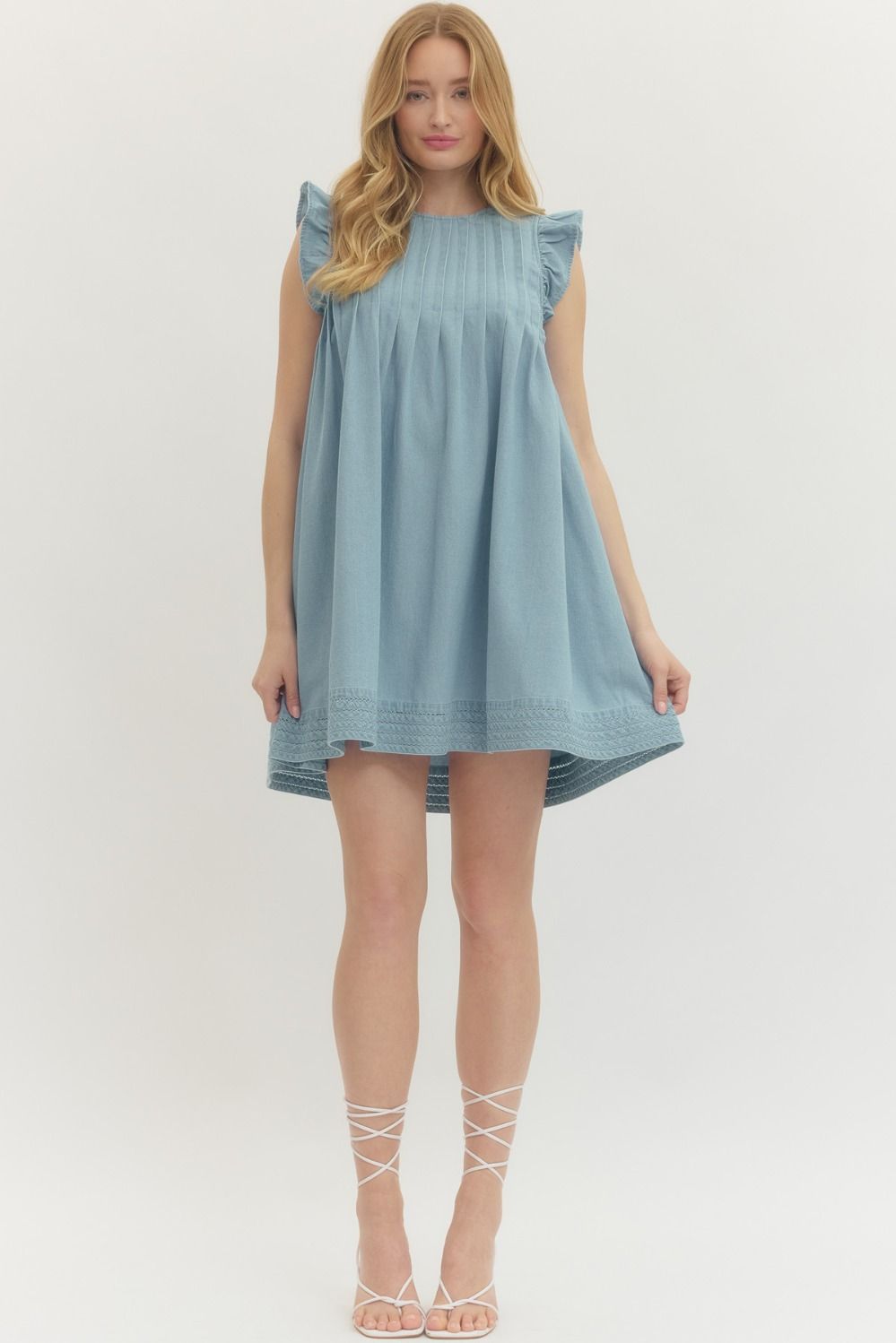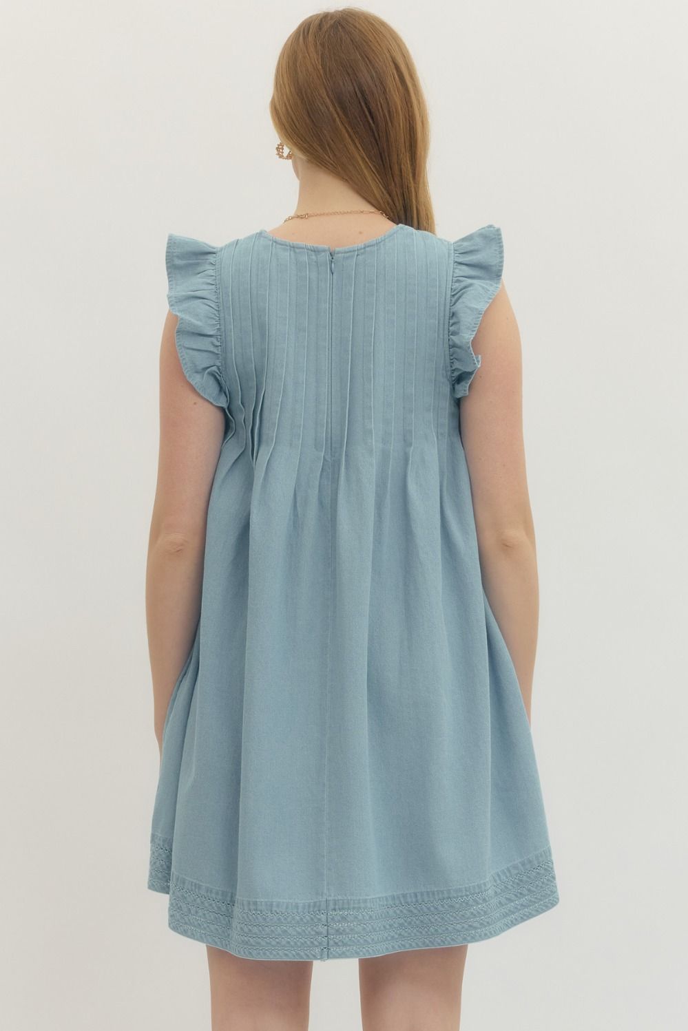 This solid denim ruffle sleeve mini dress features a front pleated panel and ruffle sleeve. Back zipper closure. Pocket at side. Unlined. Woven. Non-sheer. Lightweight.