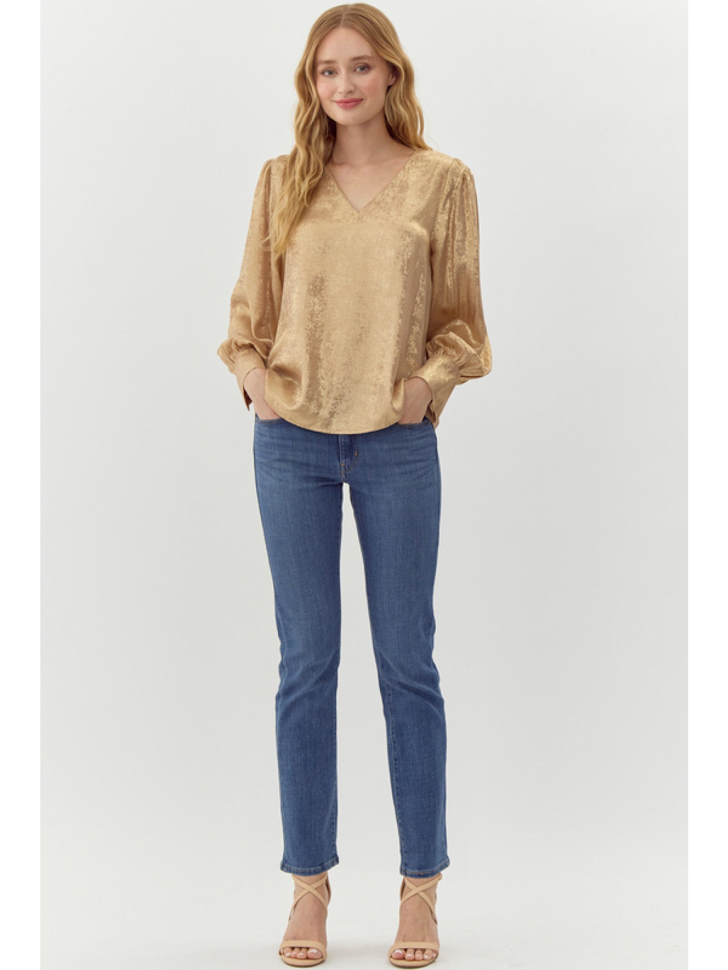 This metallic gold top features a V-neck, puffed long sleeves, and buttoned wide cuffs.- Non-sheer, lightweight.
