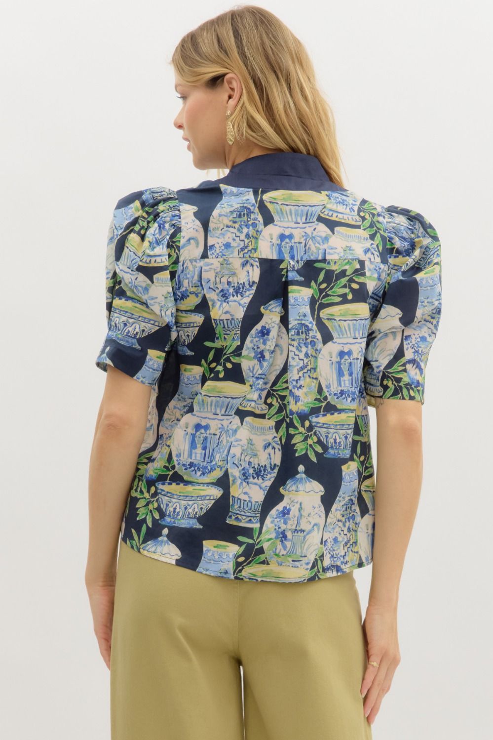 Beautiful garden landscape print short puff sleeve top. It features contrast accent placket button front closure. Unlined. Woven. Non-sheer. Lightweight.