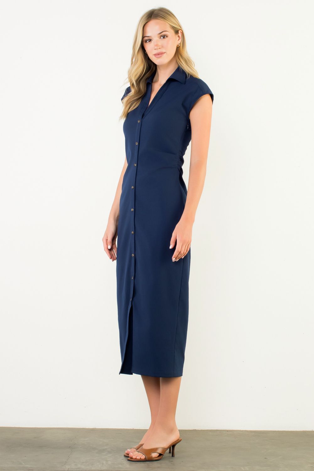 This navy button dress with ruched waist and cap sleeves is a classic.