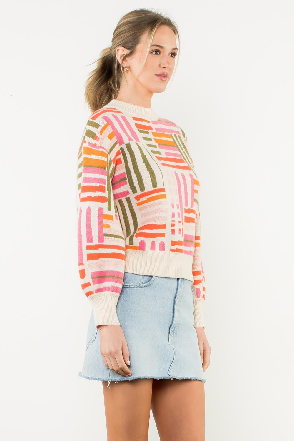This soft sweater features pretty colors of pink, orange, and olive. The balloon sleeves are a bonus.