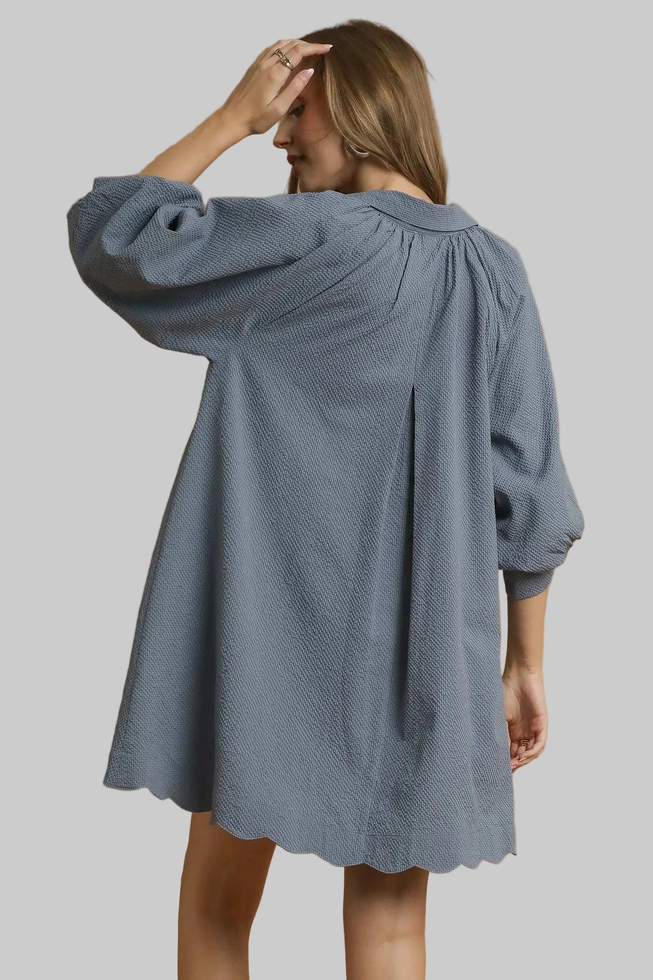 This steel blue scalloped detail tunic dress features split V-neck, 3/4 length bubble sleeves, and pockets. Light weight textured fabric. Lined