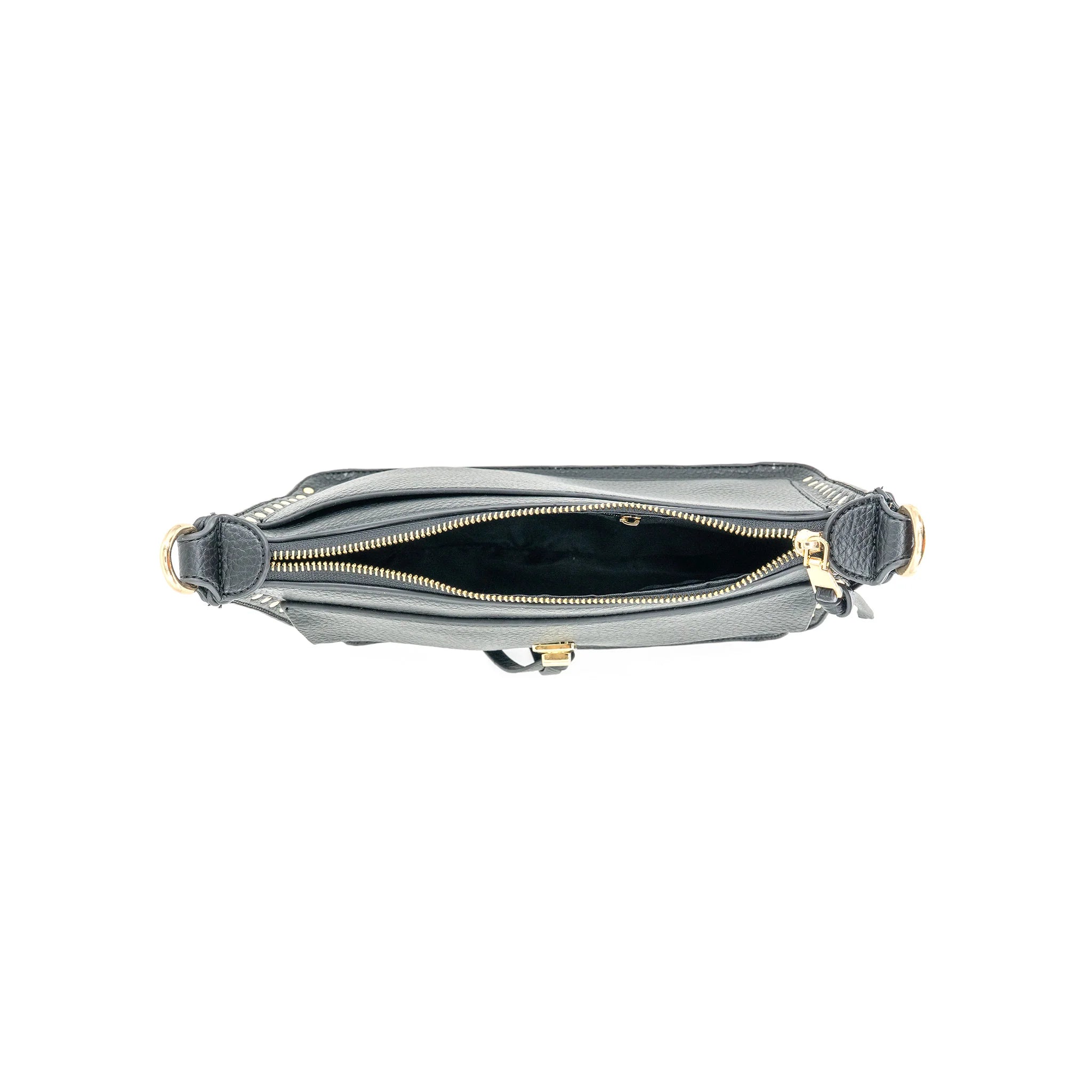 This crossbody is very versatile! This envelope style bag features stud accents, zip top and outside pocket. Inside includes a zip pouch and two packets. Includes two straps, one VL and one canvas/VL combo.