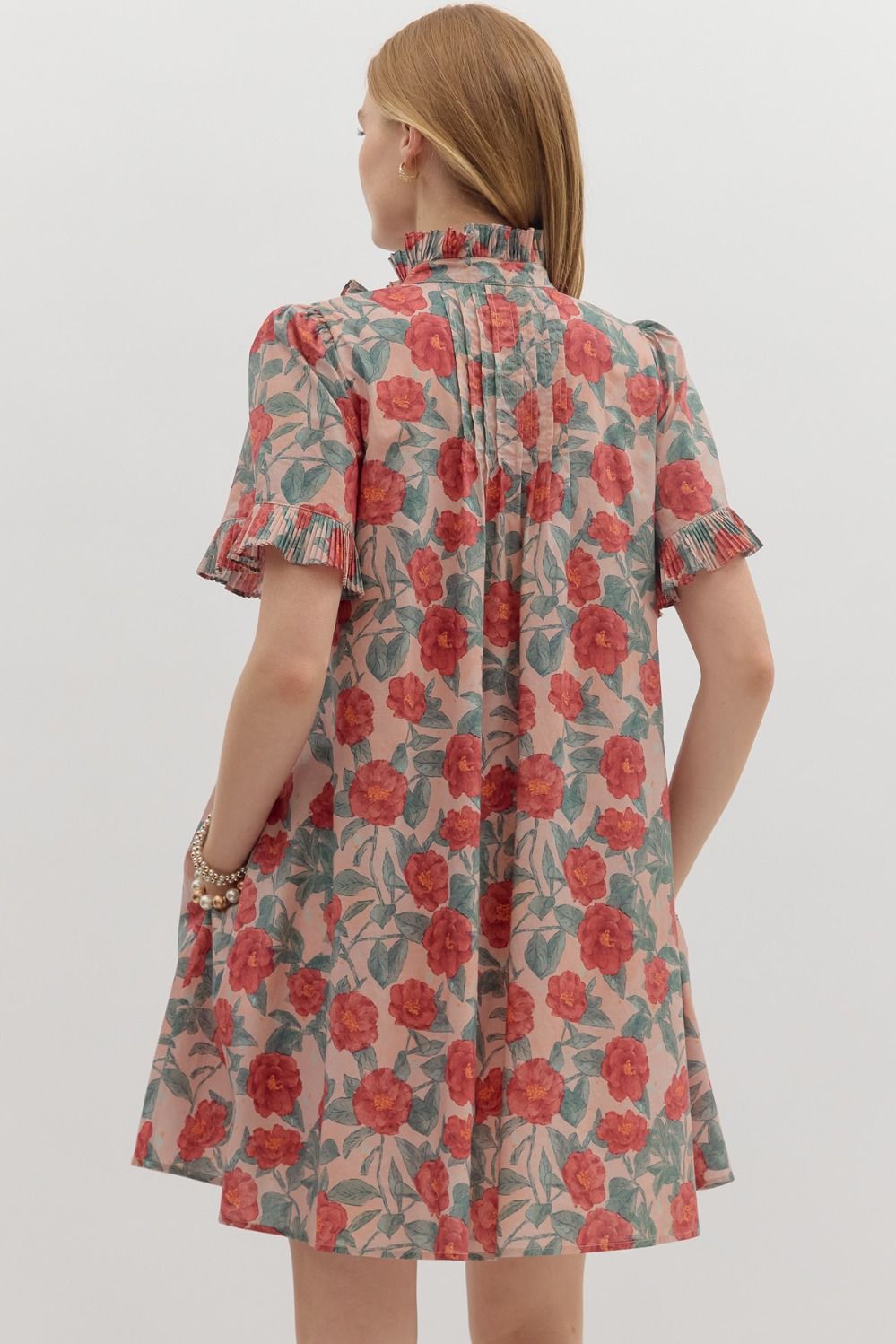 This vintage floral print dress features pleat-accent ruffle details, short sleeve, and pockets at sides. Lined. Woven. Non-sheer. Lightweight.
