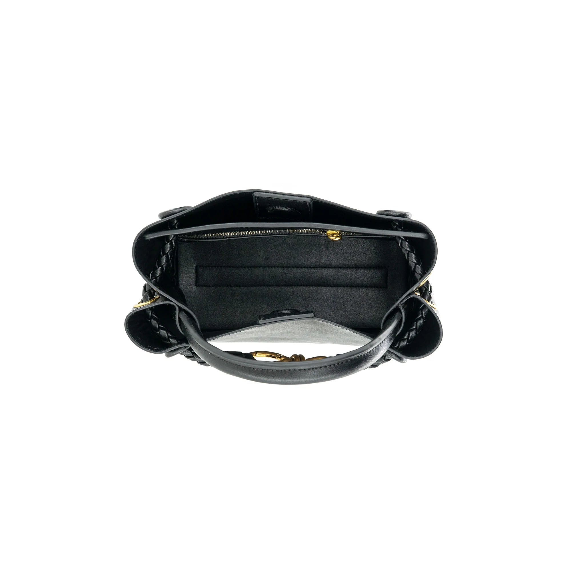 VL purse with gold bow accent. Handles and braided strap option. Inside includes a zip pocket and an open pouch.